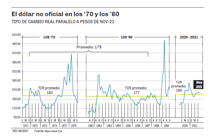 De allí surge que a precios de 2021, el paralelo fue en promedio de $182 en los turbulentos años ‘70, y de $177 al inicio de la década del ‘80 en el regreso a la democracia. Los $200 actuales lucen caros en términos reales históricos, e incluso para momentos de alta inestabilidad (ver gráfico).