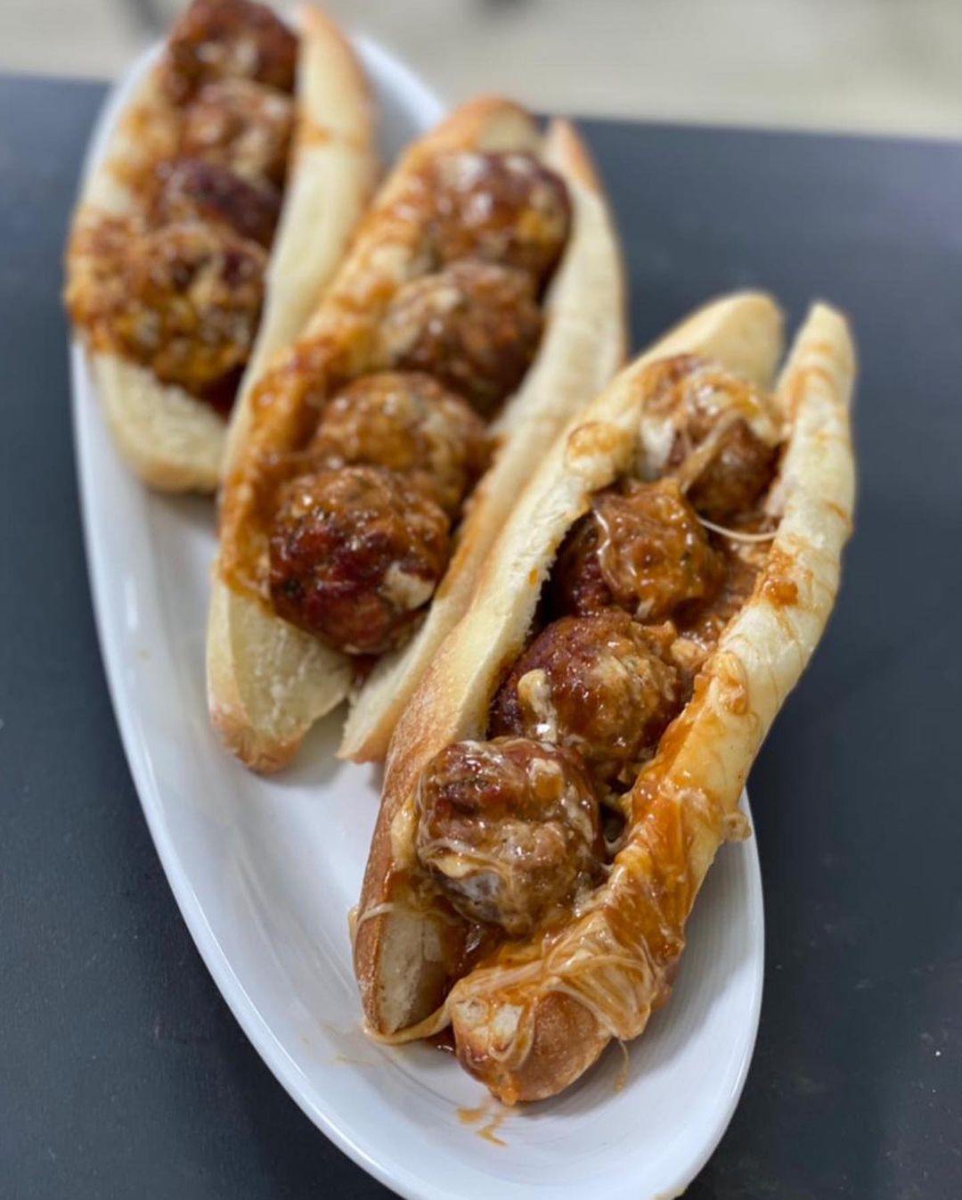Corta los panes al medio, luego agrega las albóndigas con su salsa, por encima mozzarella rallada y los tomates concassé. Lleve a horno a gratinar y sirva.