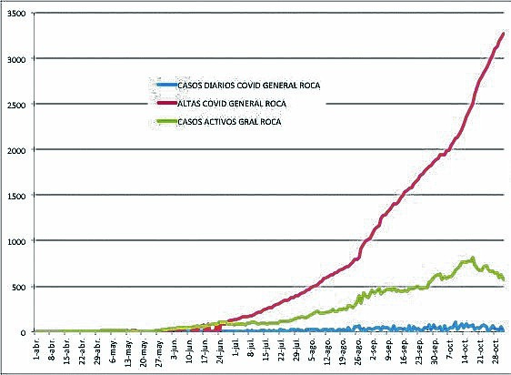 Roca volvió en el inicio de esta semana a los registros que tenía a mediados de septiembre sobre casos activos de covid-19. La tendencia en descenso en los reportes que emite el Ministerio de Salud de la provincia comenzó a registrarse a fines de octubre, cuando los pacientes recuperados empezaron a superar a los contagios detectados por el sistema sanitario.