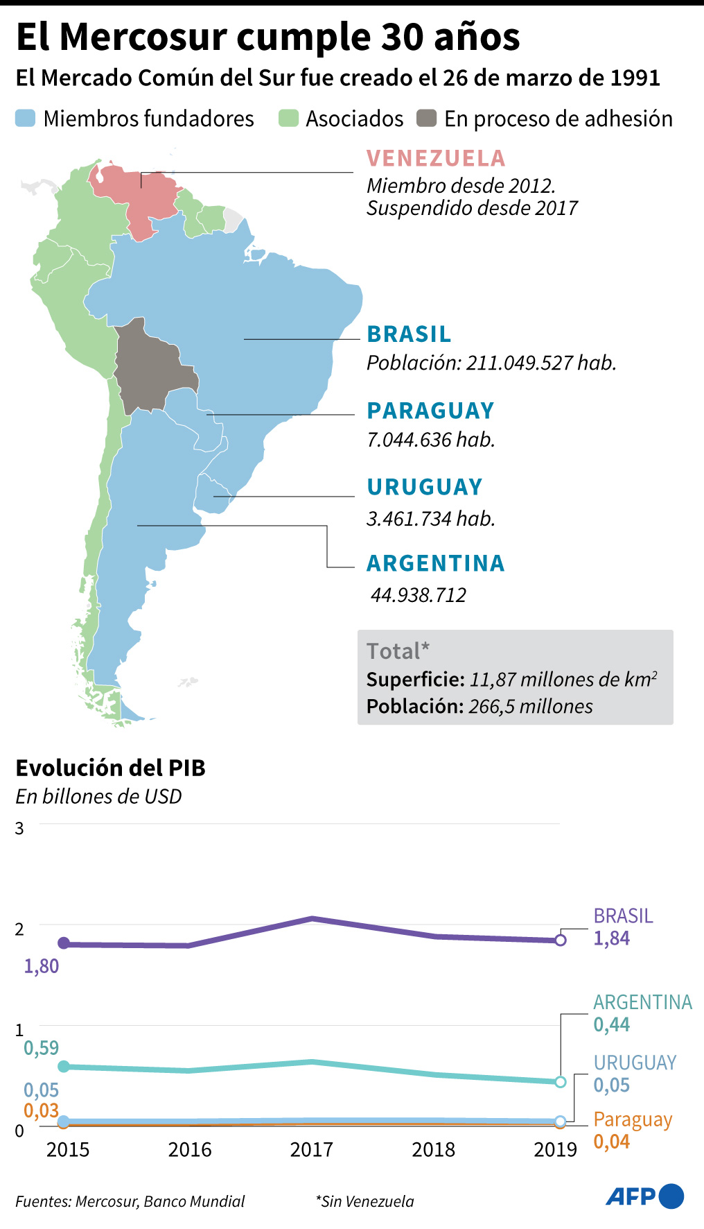 El 26 de marzo de 1991 nació el Mercado Común del Sur (Mercosur), con Argentina, Brasil, Paraguay y Uruguay. “Se reafirma la voluntad política de dejar establecidas las bases para una unión cada vez más estrecha entre nuestros pueblos”, dice el Tratado de Asunción, su acta constitutiva. En 1994, en Ouro Preto (Brasil), se acordó el arancel externo común. Actualmente es una zona de libre comercio con 295 millones de habitantes sobre más de 14 millones de kms cuadrados de territorio.