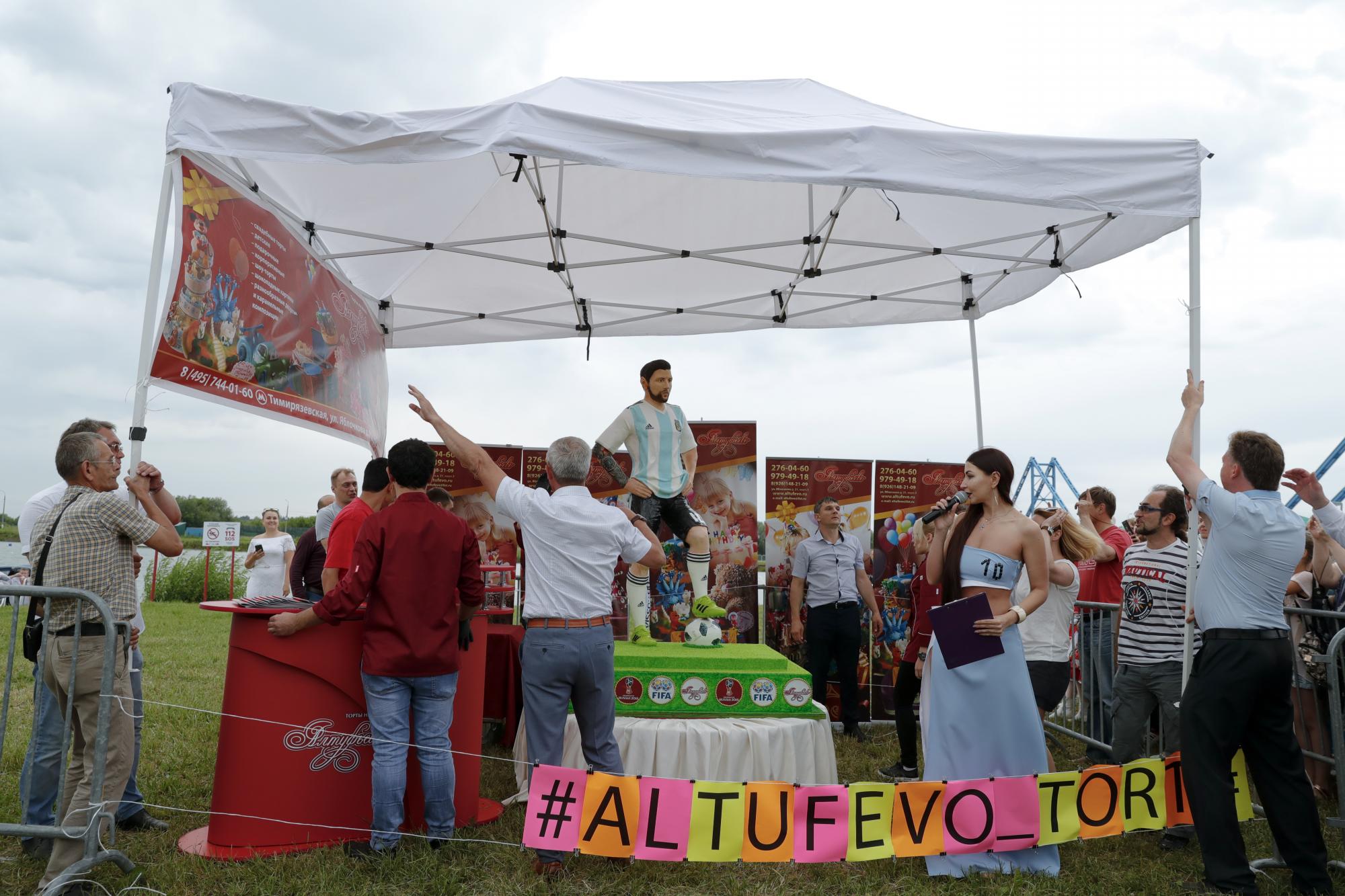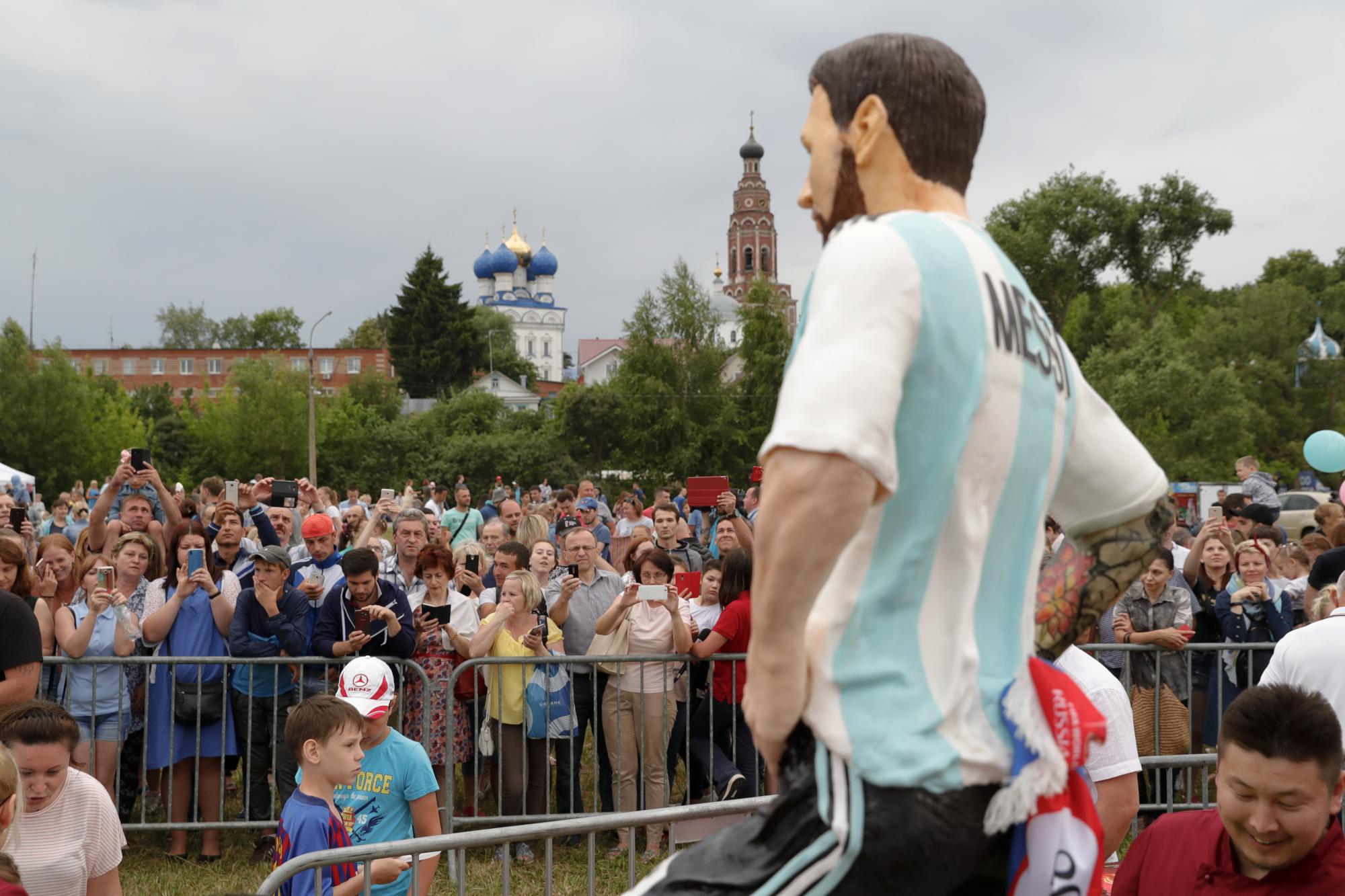 El de crema y chocolate, de 1,69 metros de altura y 70 kilogramos de peso, lo reemplazó para festejar también el Día del Comerciante, que se celebra cada 24 de junio en Rusia y, como hoy, coincidió con un domingo, lo cual permitió que más de mil personas se dieran cita en las orillas del lago que constituye una de las máximas atracciones turísticas de Bronitsy para tratar de hacer feliz, aunque sea por un rato, a un argentino nacido en una muy lejana ciudad llamada Rosario.