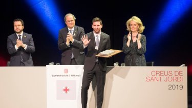 Lionel Messi recibió hoy de manos del presidente de la comunidad autónoma de Cataluña, Quim Torra, la Cruz de Sant Jordi, como reconocimiento del gobierno cataĺán por los valores de «humildad y honestidad» que encarna el jugador rosarino.
