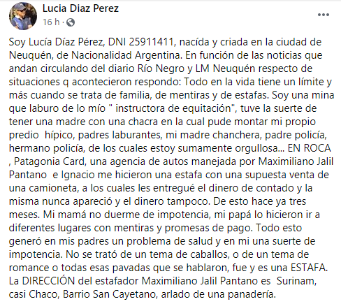 La mujer negó haberse fugado del lugar de los disparos. Es más, dijo que contó con la colaboración de la policía de Río Negro para cruzar el puente, ya que ella tenía una orden de detención. «Yo no me fui escondida ni escapada, yo me fui por la ruta y la policía no me paró porque no me quiso parar. Tal vez fue una cuestión de camaradería porque mi familia es policía o tal vez ellos sabían cómo es el paño (con los estafadores). A mi la policía (de Río Negro) me ayudó a que yo pase el puente», aseveró.