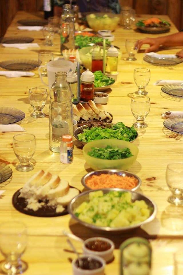 Hay un menú fijo con plato fuerte y también pizzas, pan casero. Suelen ser con velas, porque si bien algunos tienen grupo electrógeno, se intenta no alterar el ritmo de la naturaleza. Se come en mesas largas, que se comparten y se genera un momento de conexión. Muchas veces ahí nacen amistades o parejas.