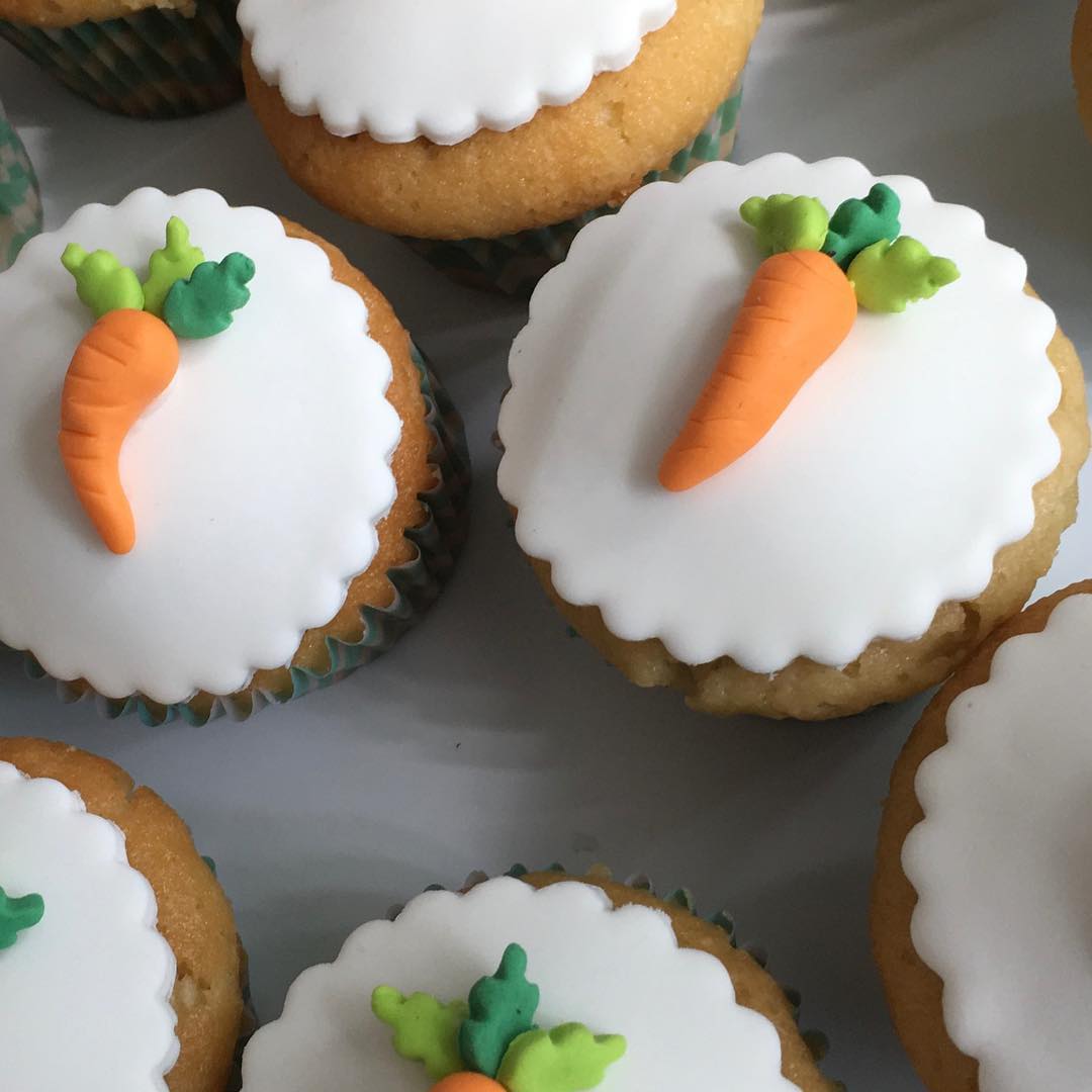 Batir los huevos con el azúcar y el aceite e incorporar todo lo demás. Colocar en pirotines y llevar a horno medio por 25 minutos. Chequear la cocción pinchando el centro con escarbadientes, tienen que salir limpitos. Si querés decorar podés colocar un circulo blanco de pasta ballina y mini zanahorias hechas de la misma pasta coloreada con colorante vegetal.