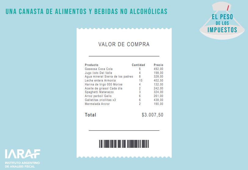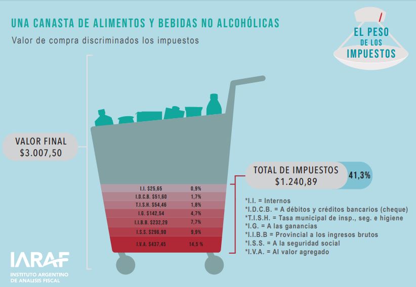 En relación a esto, el Instituto Argentino de Análisis Fiscal (IAAF) realizó un completo informe sobre el tema. Allí afirma que «en nuestro país, los productos alimenticios de consumo masivo que pasan por un proceso industrial de elaboración y por una cadena comercial de distribución, incorporan en su precio las retribuciones a los insumos, fuerza laboral, rentabilidad empresarial; así como también impuestos de los distintos niveles de gobierno».