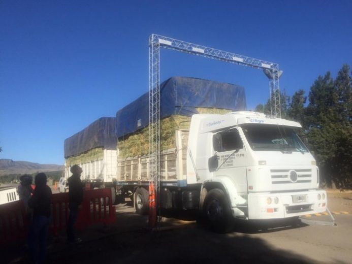 Personal municipal instaló el arco sanitario sobre la Ruta Nacional 40, a la altura de Chacra 32. Todos los camiones que ingresan a la ciudad deben pasar por el mismo para ser desinfectados.