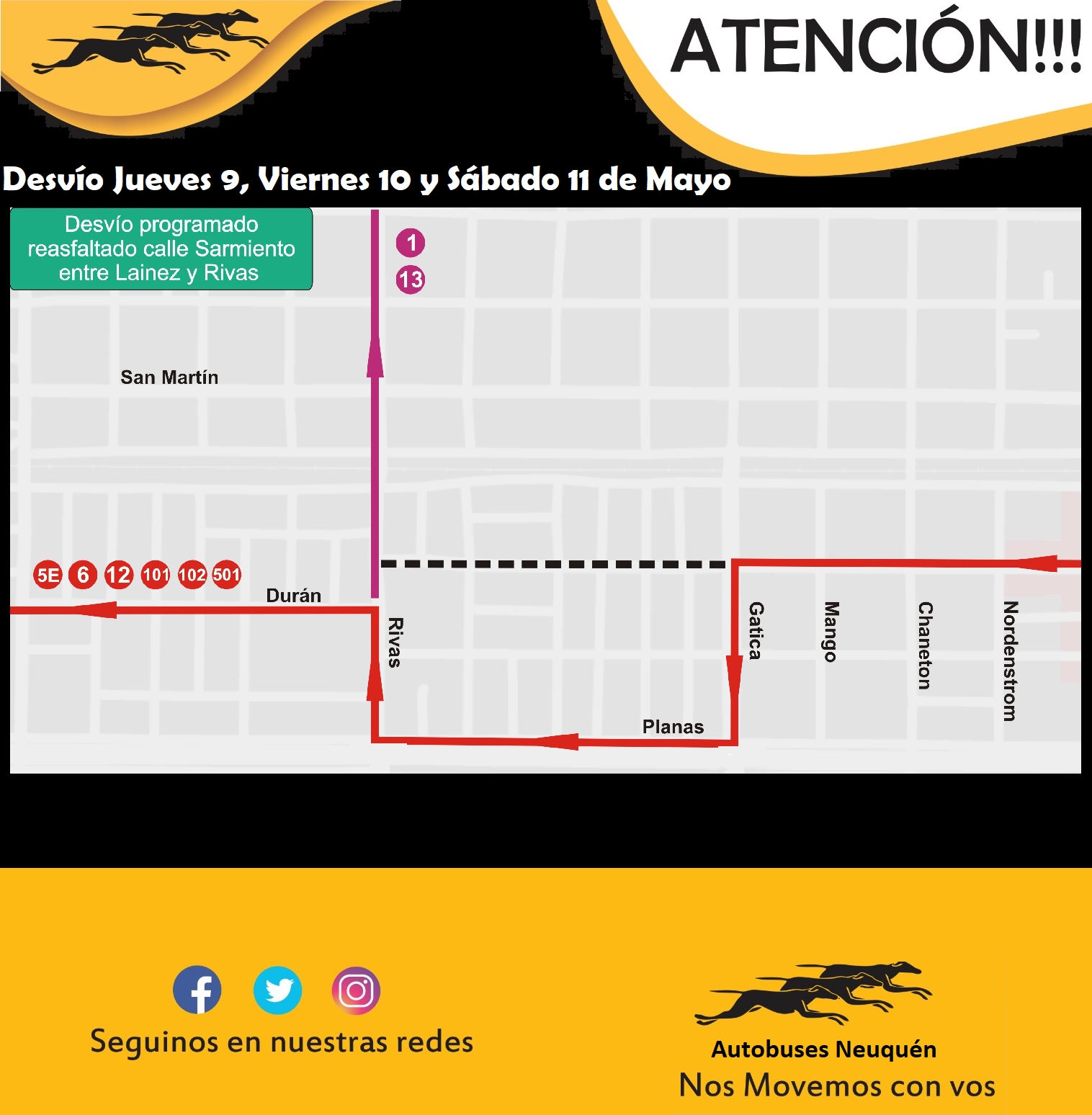 Los ramales que modifican sus recorridos son: 1, 5E, 6, 8, 9, 12, 13, 15, 101, 102, 501 y 502. Por el desvío de hoy, los colectivos no circularán entre Don Bosco y Nordenstrom. Mañana y pasado se extenderá hasta Mango. Desde el jueves hasta el sábado no se circulará desde Gática hasta Rivas.