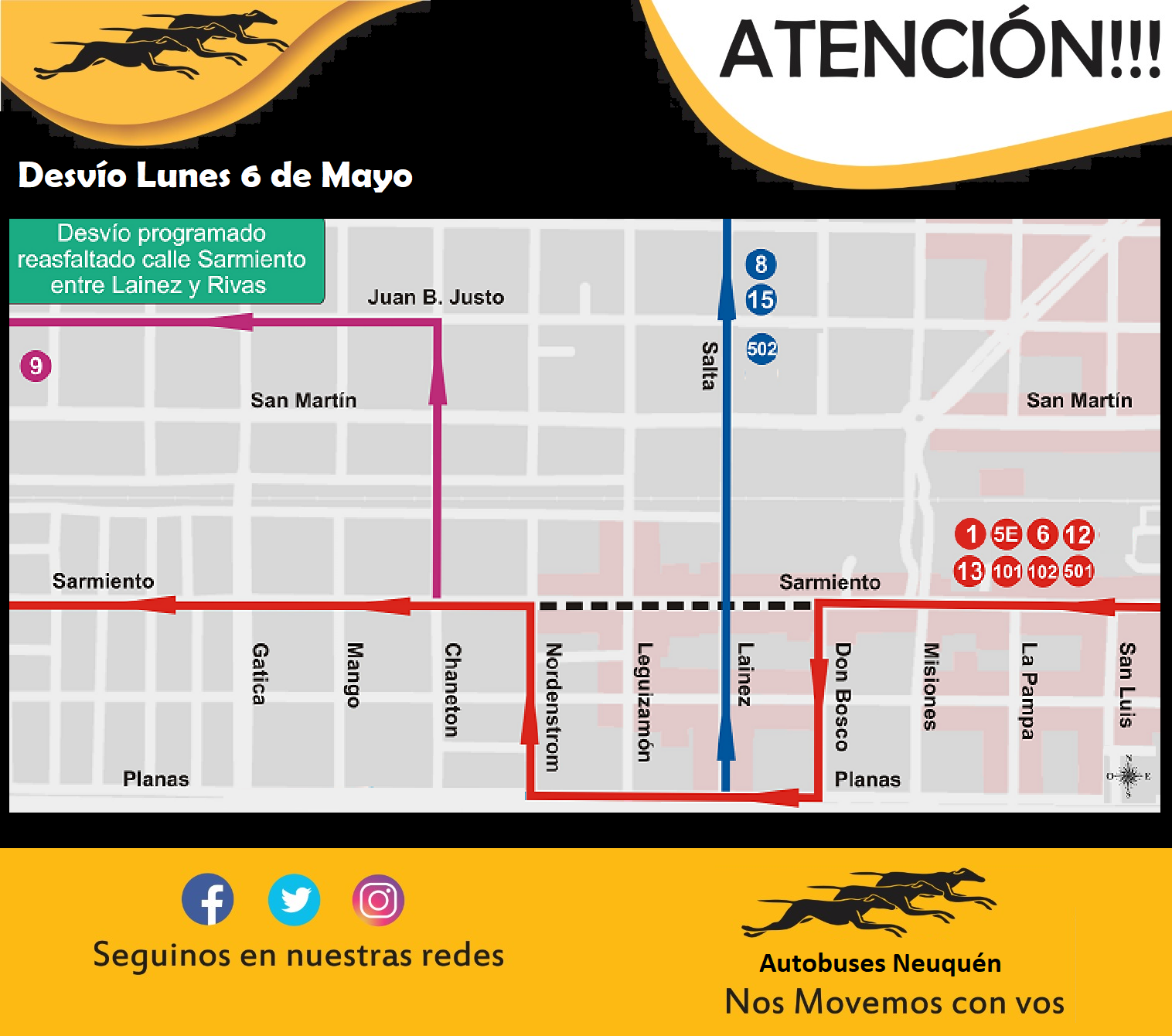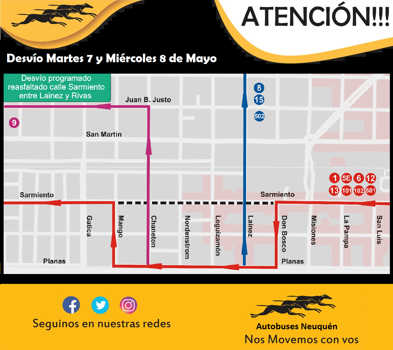A partir de hoy se comenzaron a realizar los cortes sobre la calle Sarmiento en la zona del Bajo de Neuquén para la repavimentación de la calzada y las tareas necesarias para la implementación de los carriles preferenciales que buscan mejorar los tiempos del transporte público. A causa de las mismas, 12 ramales de colectivos modificaron sus recorridos durante esta semana.