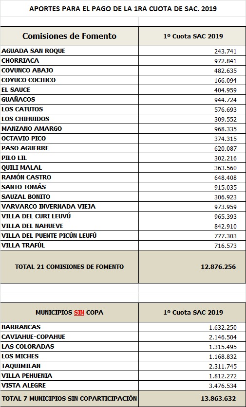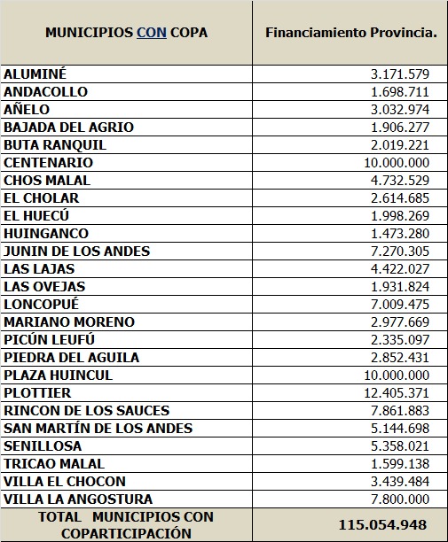 El tercer lugar es de Rincón de los Sauces con 7.861.000 pesos, seguido por Villa La Angostura que recibió 7.800.000 pesos, Junín de los Andes con 7.270.000 pesos y Loncopué 7.009.000 pesos.