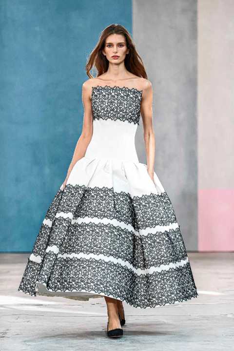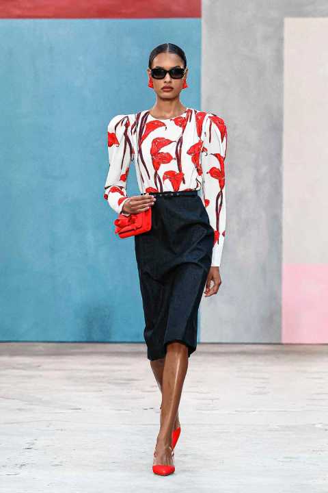 La colección se movió entre la precisión de la sastrería y destellos nocturnos. El blanco y negro dominaron en camisas de algodón y faldas lápiz de talle alto: un binomio pulido, atemporal, con eco ochentoso. El rojo —insignia de la casa— apareció en vestidos y trajes de mangas abullonadas y cintura marcada, reafirmando una feminidad decidida.