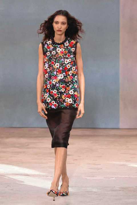 La escena fue refinada, clásica, con una elegancia casi conservadora que dialoga con los códigos históricos de la casa y un revival de los 80. Hubo vestidos de cóctel con estampado felino y paneles metalizados, siluetas definidas y una impronta segura, en sintonía con ese universo femenino de porte impecable.