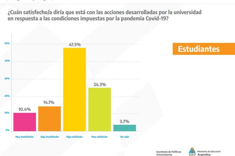 Lo que surge de las encuestas es que la gran mayoría de autoridades, personal y estudiantes está satisfecho con la respuesta a la pandemia que dio la universidad. Casi 7 de cada 10 docentes encuestados (67%) respondió que estaban “satisfechos” y “muy satisfechos”. En la misma sintonía, los estudiantes y trabajadores no docentes manifestaron similar o aún mayor conformidad (72% los primeros y 76% los segundos)