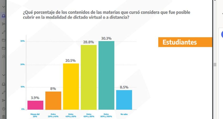 Tecchi, por su parte, destacó que de acuerdo a la propia encuesta, que coinciden con apreciaciones del CIN, “están los alumnos que por situaciones insalvables no pudieron conectarse, pero también los estudiantes que sacaron una foto con algún celular, que les prestaron, al trabajo práctico que le encomendó su profesor” .