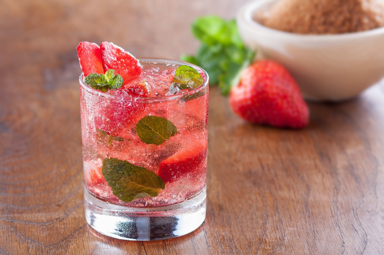 En un vaso, también con la ayuda de un mortero, aplastar suavemente las frutillas, cubitos de limón, azúcar, limón exprimido y hojas de menta. Agregar el hielo picado hasta llenar aproximadamente la mitad del vaso. Luego, echar el ron y volver a mezclar con todo el contenido del vaso. Agregar un poco más de hielo y llenar con soda. Decorar con hoja de menta y una frutilla entera.