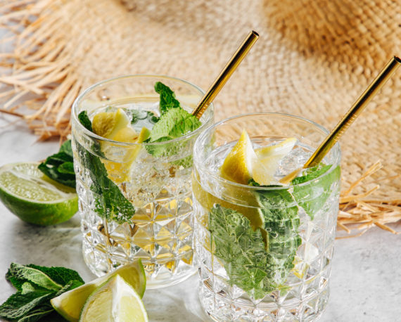 En un vaso, con la ayuda de un mortero, aplastar suavemente los cubitos de lima o limón con el azúcar, limón exprimido y hojas de menta. Agregar el hielo picado hasta llenar aproximadamente la mitad del vaso. Luego, echar el espumante y mezclar con el resto del contenido del vaso. Decorar con hoja de menta y rodaja de limón.