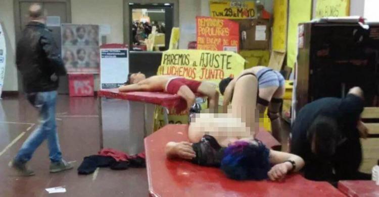 La performance bajo el título “Miércoles de placer” incluyó la participación de varios actores, entre ellos mujeres desnudas que protagonizaron escenas de masturbación sobre una mesa montada en los pasillos de ingreso a la factultad a la hora en que cientos de estudiantes acuden a clase.