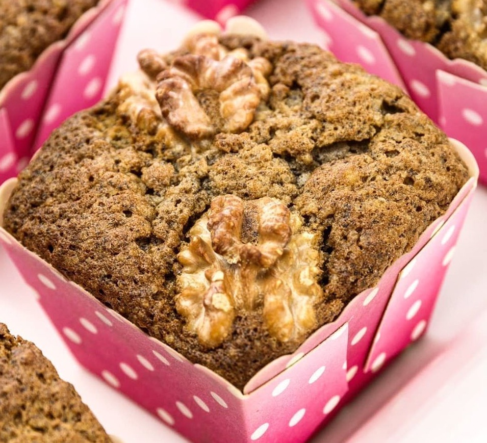 Poner la masa en moldes de papel para muffins. Calcular unos 45 g de masa por cada muffin. Cubrir con nueces en mitades. Hornear a 170º C tiempo por 20 a 25 minutos.