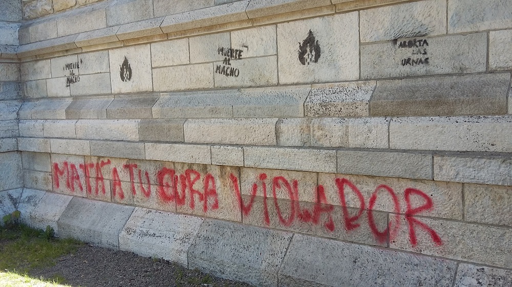 Una de las frases con tinta roja indica: “Puta, lesbiana, gorda y abortista. Abortá la moral”. En otro sector de la pared de la Catedral plasmaron “Matá a tu cura violador” y pintaron sellos con la frase “muerte al macho” y una imagen del contorno de una iglesia envuelto en llamas.