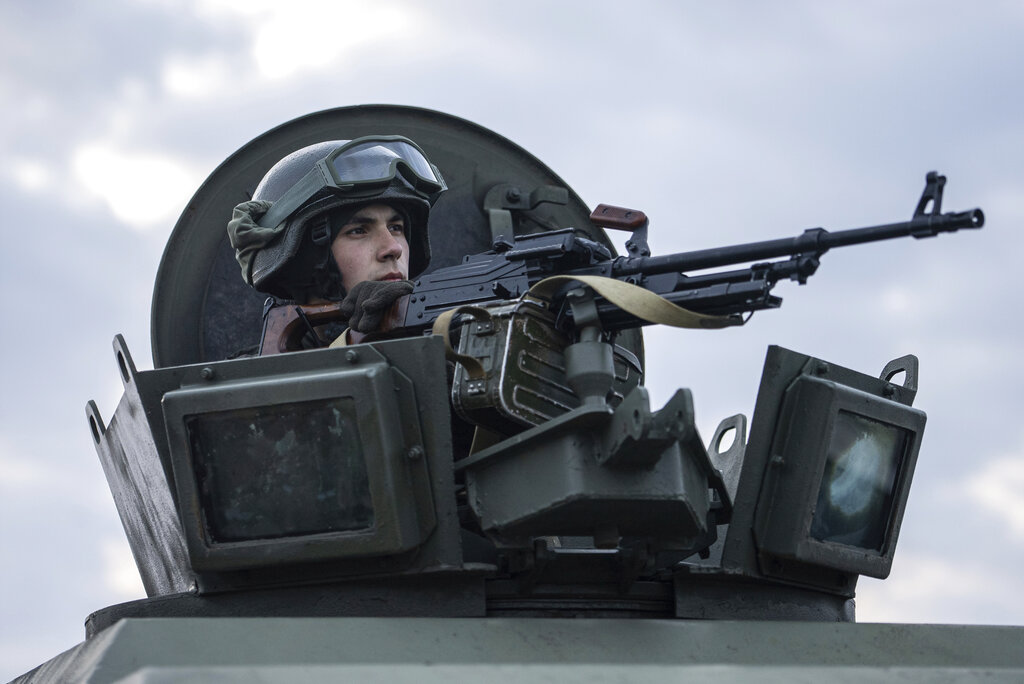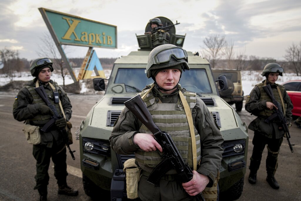 Ukrainian National guard soldiers guard a mobile checkpoint together with the Ukrainian Security Service agents and police officers during a joint operation in Kharkiv, Ukraine, Thursday, Feb. 17, 2022. Fears of a new war in Europe have resurged as U.S. President Joe Biden warned that Russia could invade Ukraine within days, and violence spiked in a long-running standoff in eastern Ukraine that some fear could be the spark for wider conflict. (AP Photo/Evgeniy Maloletka)