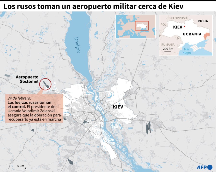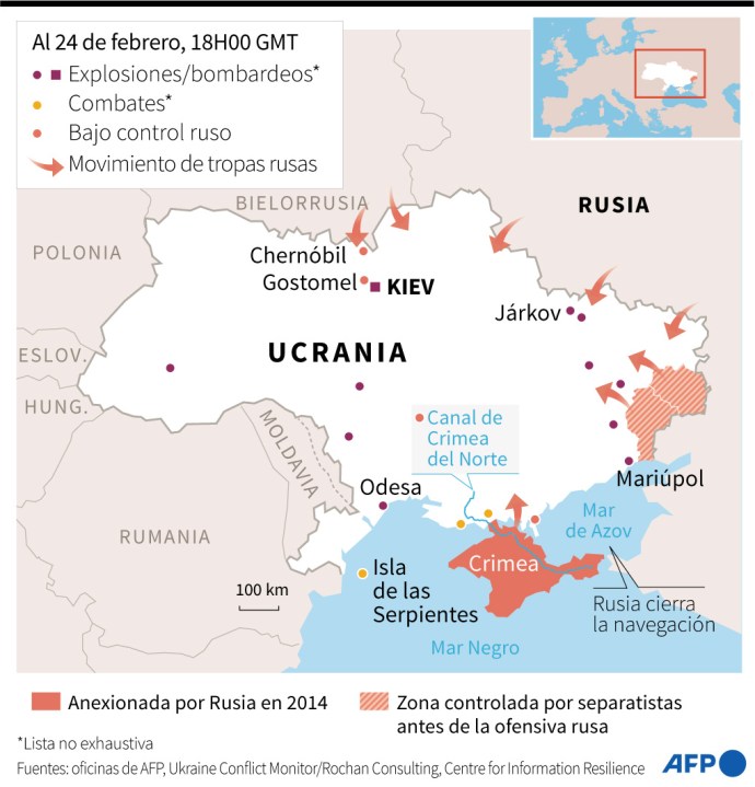 En tierra, soldados rusos ya iniciaron incursiones en dirección de Kiev, pero también alrededor de los territorios separatistas prorrusos de Donetsk y Lugansk, cuya independencia acaba de reconocer Rusia.