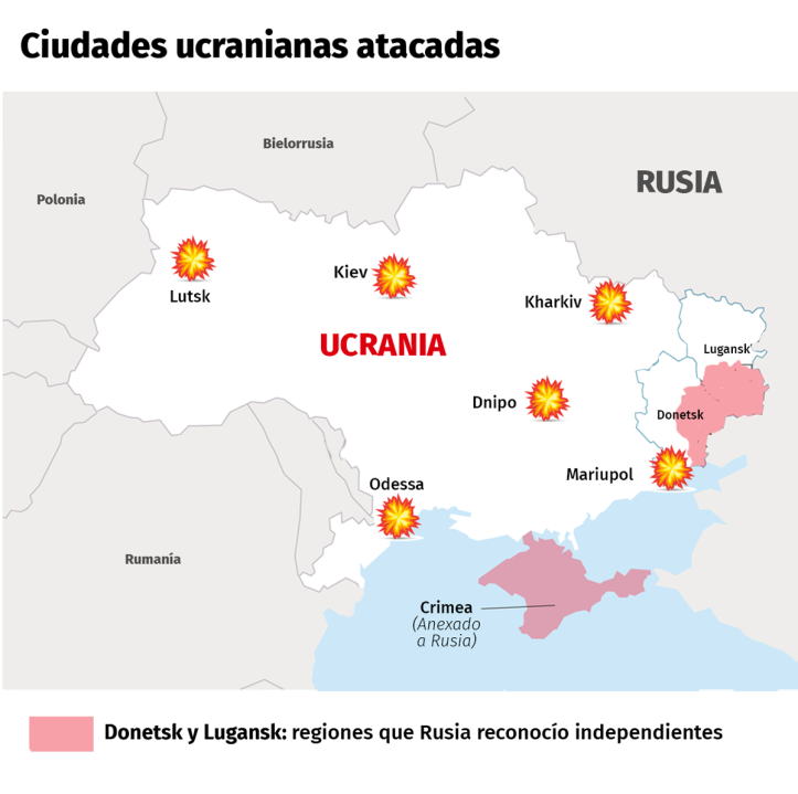 El presidente de Rusia, Vladimir Putin, reconoció el lunes la independencia de dos provincias separatistas y rusoparlantes. Fue la previa de la intervención militar que esta madrugada justificó por el incumplimiento de los acuerdos de Misk y exponer el avance de Occidente con la OTAN.
