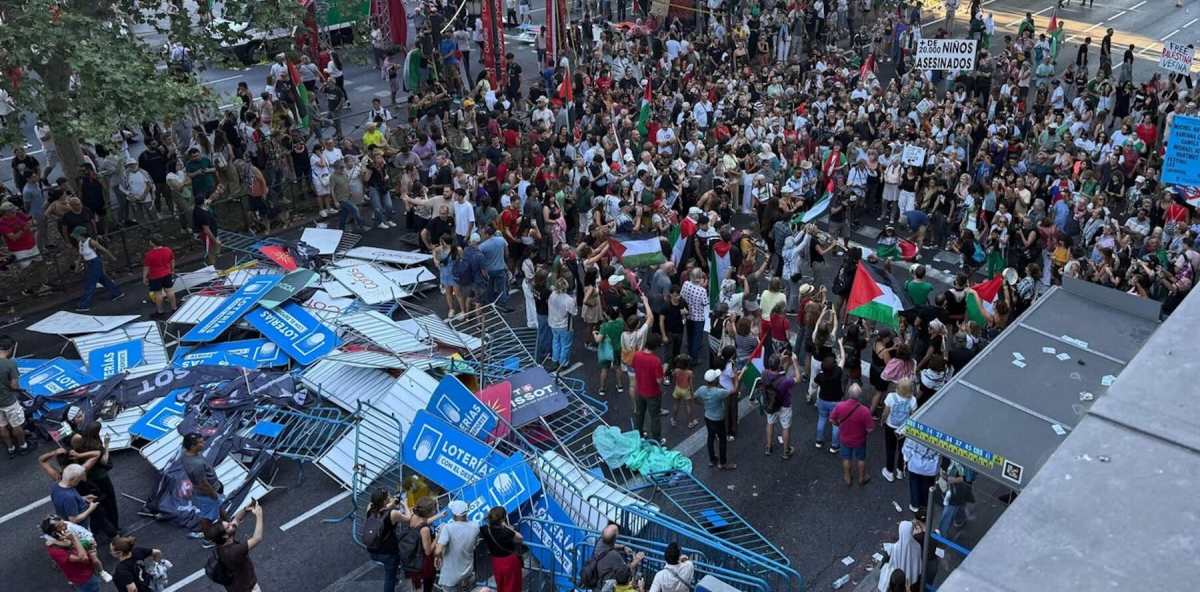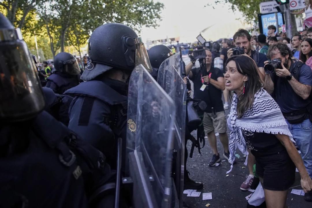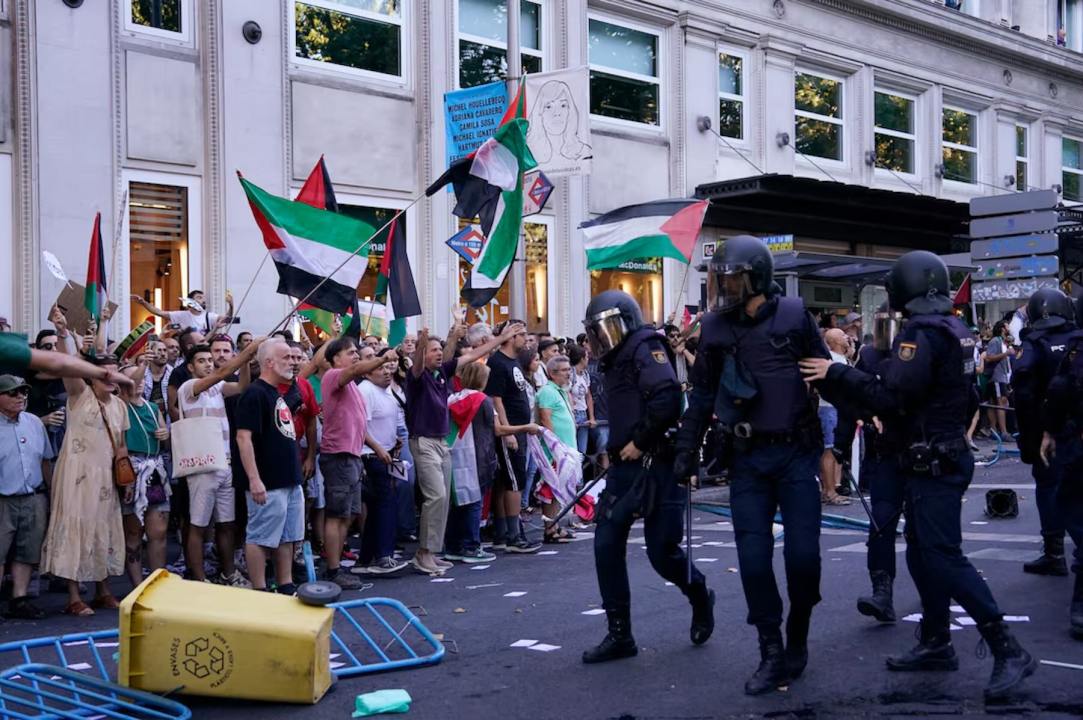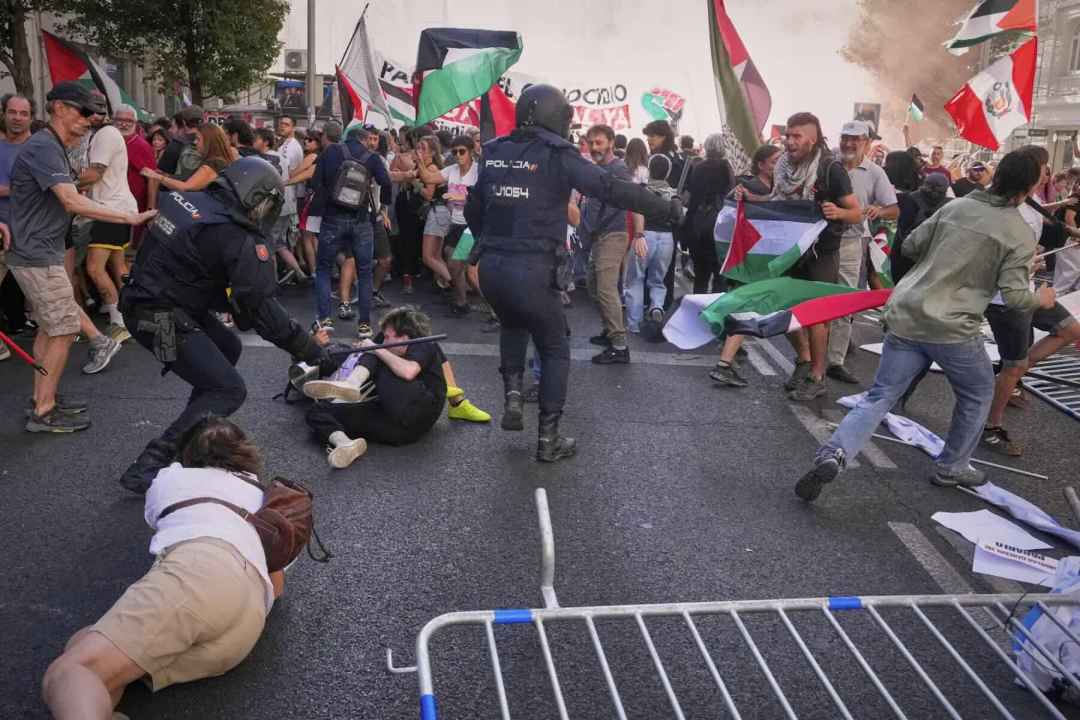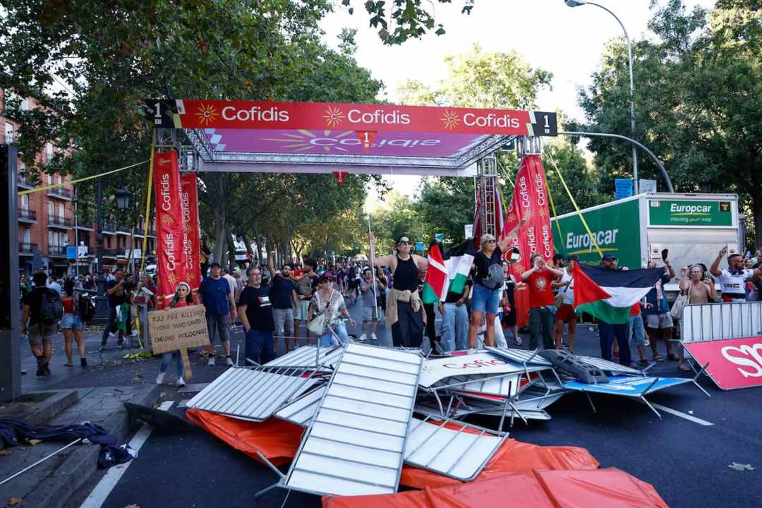 En la Gran Vía, que los ciclistas deben recorrer varias veces en la capital española, los manifestantes derribaron las barreras instaladas a lo largo de la avenida, antes de corear llamados al boicot de Israel.