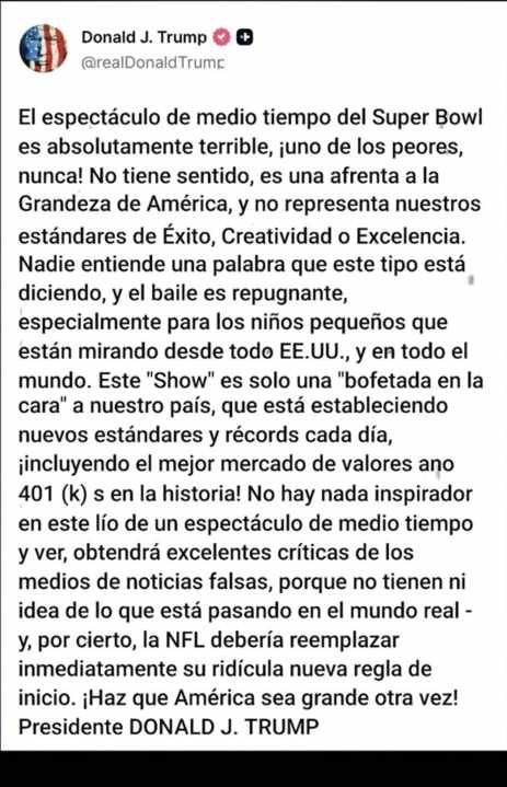 El ataque no se limitó al artista; Trump también arremetió contra la NFL por la elección del «Conejo Malo» y aprovechó para burlarse de los medios de comunicación, asegurando que los «Fake News» elogiarán el show por no entender «lo que sucede en el mundo real«.