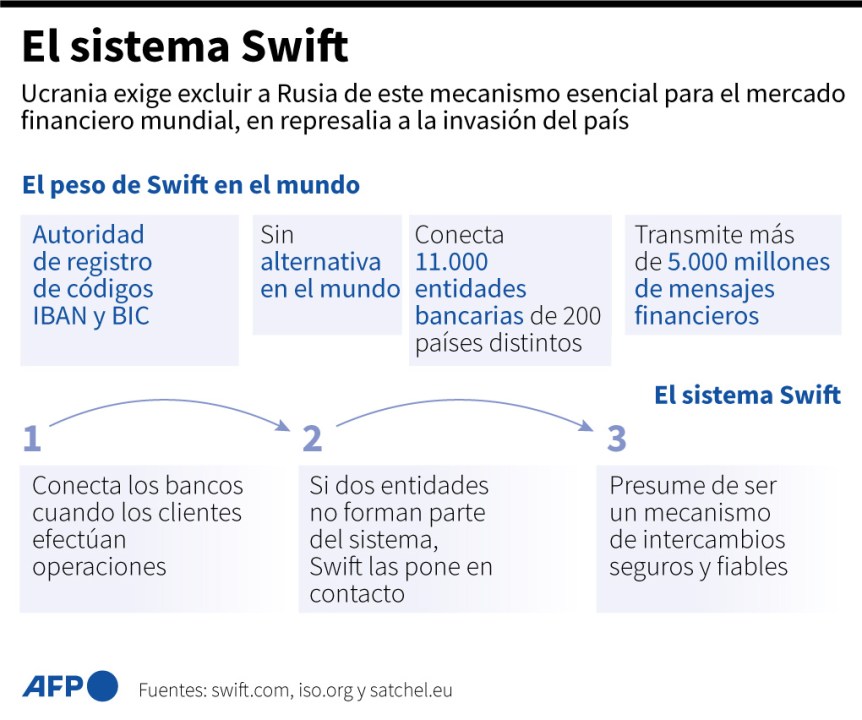 Las potencias occidentales anuncciaron en las últimas excluirán a varios bancos rusos de la plataforma SWIFT, en la sanción más dura de las impuestas a Moscú por la invasión de Ucrania.