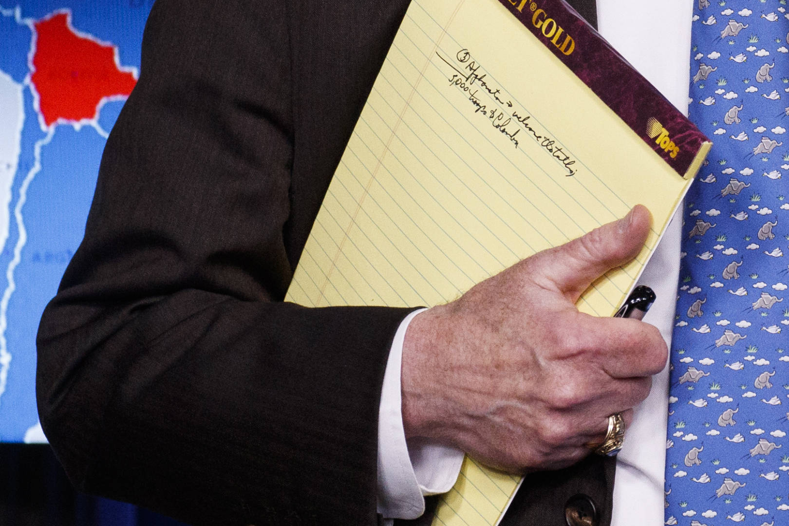 El consejero de Seguridad Nacional del presidente estadounidense Donald Trump, John Bolton, no se cuidó de esconder las notas que llevaba en su libreta este lunes cuando compareció ante la prensa para anunciar nuevas sanciones contra Venezuela.
