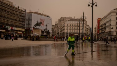 Personas limpiando con mangueras sus coches, sus terrazas o los portales de los edificios se podían ver en pleno centro de la capital española, donde este fino polvo ocre transformó el paisaje.