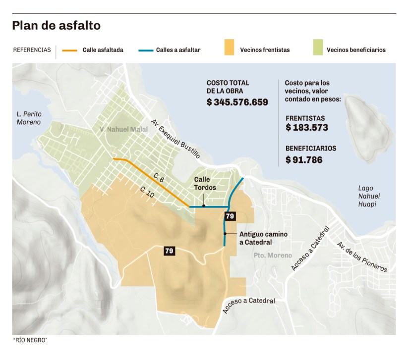 El propietario de una casa en Bariloche ubicada en el kilómetro 14, a metros de la costa del lago Moreno, debería pagar 91.786 pesos al contado o 171.036 pesos, en caso de optar por un plan de 36 cuotas, por una obra de asfalto que la Municipalidad realizará a 4,3 kilómetros de distancia de su domicilio para generar una conexión pavimentada que descomprima la avenida Bustillo en la zona oeste.