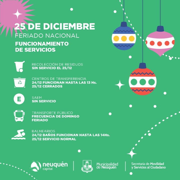 Desde el Municipio de Neuquén comunicaron cómo funcionarán los servicios en Nochebuena y Navidad. Lo que hay que tener en cuenta para las fiestas de fin de año.
