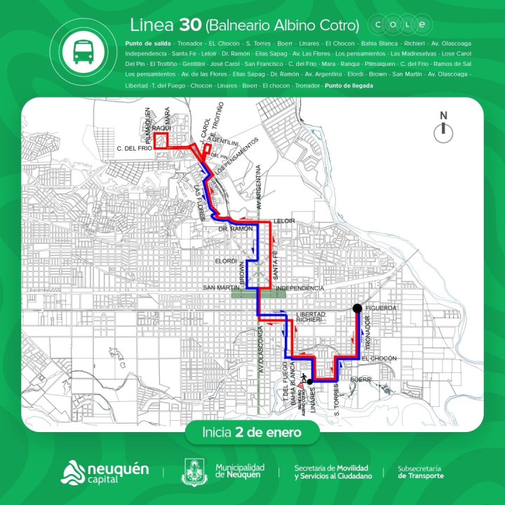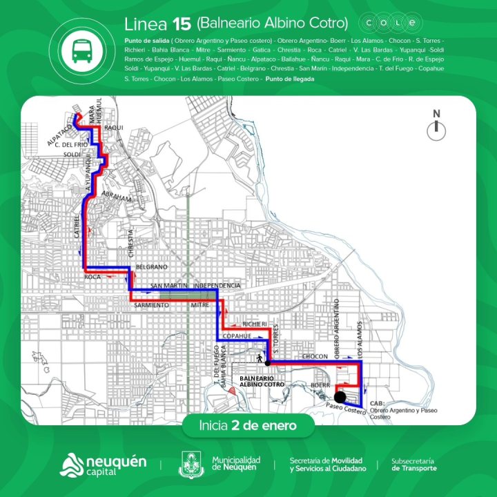 Desde el Municipio de Neuquén comunicaron que durante enero y febrero, se extendieron recorridos y se sumaron líneas nuevas que van hasta la zona costera del río Limay. Se agregó un servicio que parte desde el centro. Acá los detalles y por qué puntos transitan los ramales.