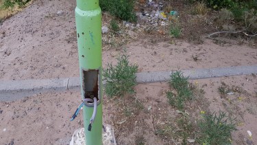 La plaza que se ubica frente al centro de salud, expone el crecimiento de los yuyos, escombros, juegos rotos pero lo que más preocupa a los vecinos es que los postes de luz, que están sin funcionar, tienen cables pelados al alcance de cualquier niño o niña que juegue cerca.