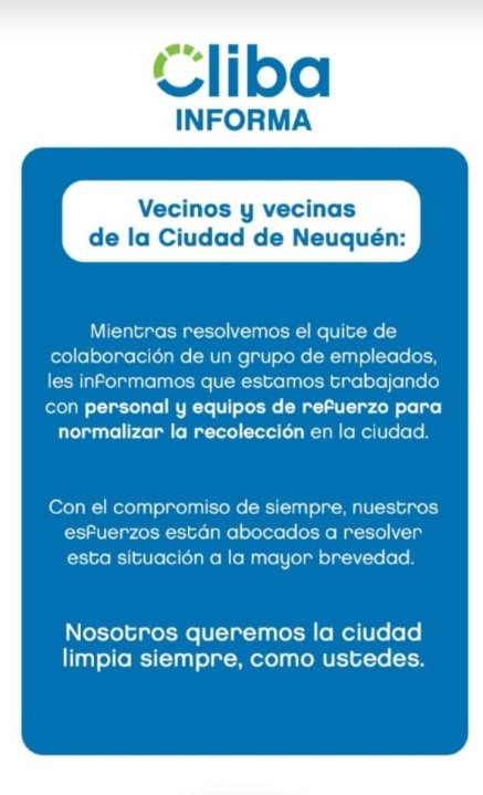 Ante el silencio de la municipalidad de Neuquén, la empresa Cliba publicó un comunicado en sus redes sociales dirigido a los vecinos de la ciudad de Neuquén.