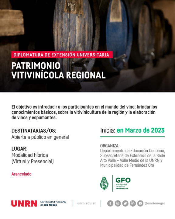 Para información sobre periodo de inscripción se pueden pueden dirigir al siguiente link: https://www.unrn.edu.ar/…/Patrimonio-vitivinicola?fbclid=IwAR1uQwtshEPZxrp204EKK5fyTNoxrdjzaN4xv1-R0Sn-kQ0f9QAUuGxL8RY