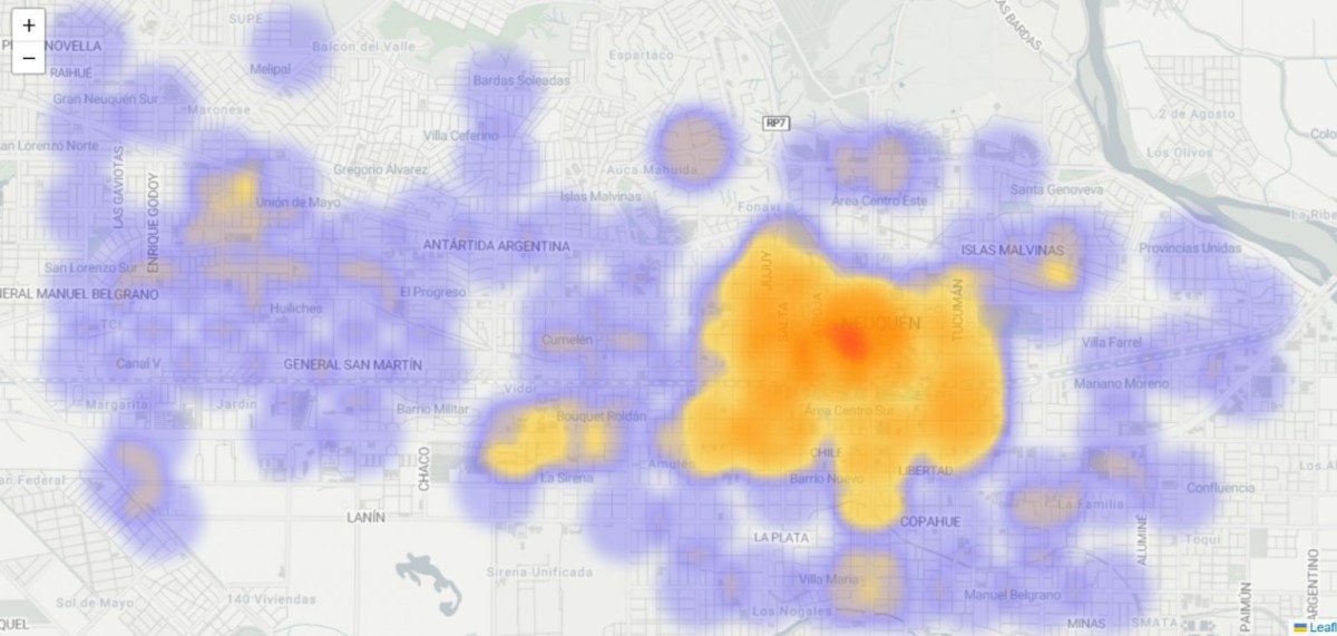 El mapa de calor incluido en el informe ubica el área de mayor concentración en el centro de la ciudad, especialmente sobre la Avenida Mosconi y calles cercanas. Allí se registran los niveles más altos de infracciones captadas por cámaras.