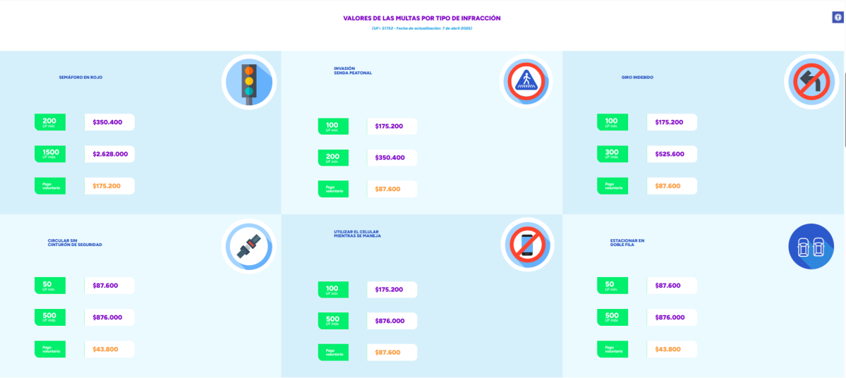 En cuanto a los montos, las multas más altas se registran por el cruce de semáforo en rojo, con valores que pueden superar los $2.600.000. En el caso de giros indebidos o invasión de senda peatonal, las sanciones también superan los $500.000 en su rango máximo. En caso de acceder al pago voluntario, el usuario abonará la mitad del mínimo correspondiente a cada tipo de infracción.