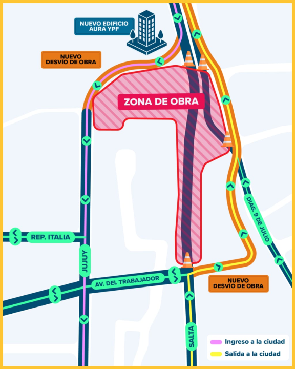 La circulación por calle Salta se interrumpe de forma total a la altura de la Avenida del Trabajador. En dicha intersección, es obligatorio realizar un retome hacia la Diagonal 9 de Julio. Desde la diagonal, los vehículos podrán reincorporarse más adelante a la Avenida Alfonsín para continuar el trayecto hacia Centenario o la zona de bardas.
