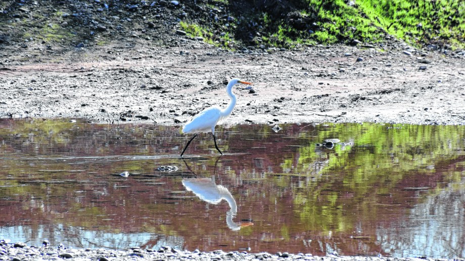 En el ingreso al Parque Agreste, una garza blanca saludó esquiva al fotógrafo de “Río Negro” durante una recorrida en busca de una imagen para esta nota, porque el sector es rico en avifauna y en especies que anidan en el río, como el pato criollo, garzas blancas y aunque más rara, también se ve la garza mora, además de los cisnes.