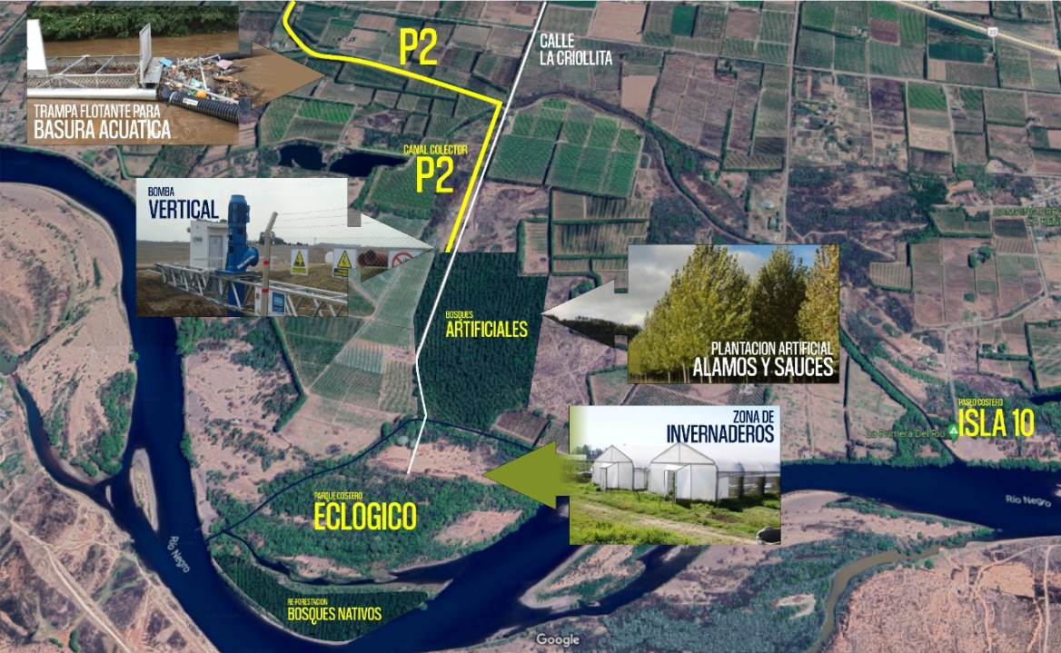 Los bosques artificiales se constituirán con álamos y sauces criollos. Estos serán irrigados con aguas residuales del canal colector. Con esta forma de riego se evitará la contaminación del Paseo Costero del barrio ex Isla 10, los balnearios de Allen y la toma de agua potable.