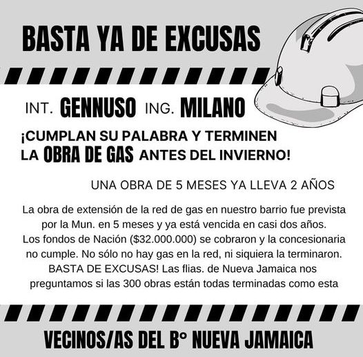 Los reproches apuntaron al intendente Gustavo Gennuso y al subsecretario de la Unidad Ejecutora de Obras Públicas del municipio, Alfredo Milano. Exigen que se termine la red de gas en el barrio antes del invierno para poder realizar la conexiones.