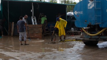 La gran cantidad de agua que cayó en pocos minutos inundó las instalaciones y calles internas donde se encuentran los espacios destinados a los stand de productores, puestos de artesanos, de productores y los puestos de gastronomía. En este sector trabajó personal municipal con bombas y camiones para quitar el agua acumulada.