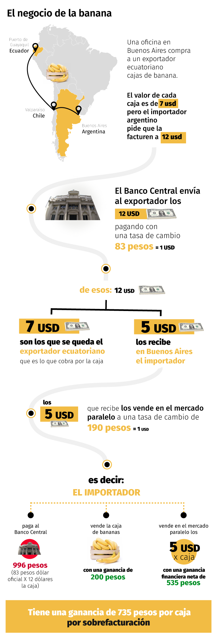 -Con 7 dólares se queda el exportador ecuatoriano que es lo que cobra por la caja de frutas y 5 dólares vuelven a manos del importador en Buenos Aires a través de una triangulación financiera.