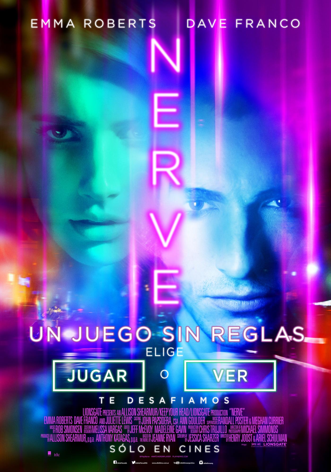 En la película Nerve funciona a través de una aplicación que, cuando uno decide convertirse en jugador, permite que los seguidores accedan a la información personal de Facebook, Instagram, Snapchat, todo lo que se esté usando. Así se van creando los retos según los miedos y aspiraciones de los participantes, y se los lleva hasta sus límites. “La gente pone hoy día toda su vida en Internet. Esta película toma ese fenómeno y lo lleva un paso más allá”, señala Emma Roberts. Y continúa: “Nada es verdaderamente privado. Creo que este film explota esa sensación. Cualquiera puede acabar viendo cualquier cosa que publiques, tanto si querés como si no”. Por su parte, Dave Franco comenta: “El guión trata un tema muy relevante ahora mismo. La gente no se comporta como sí misma cuando se oculta tras la pantalla de una computadora. Están dispuestos a hacer y decir cosas que no serían aceptables cuando tratás con alguien cara a cara”.