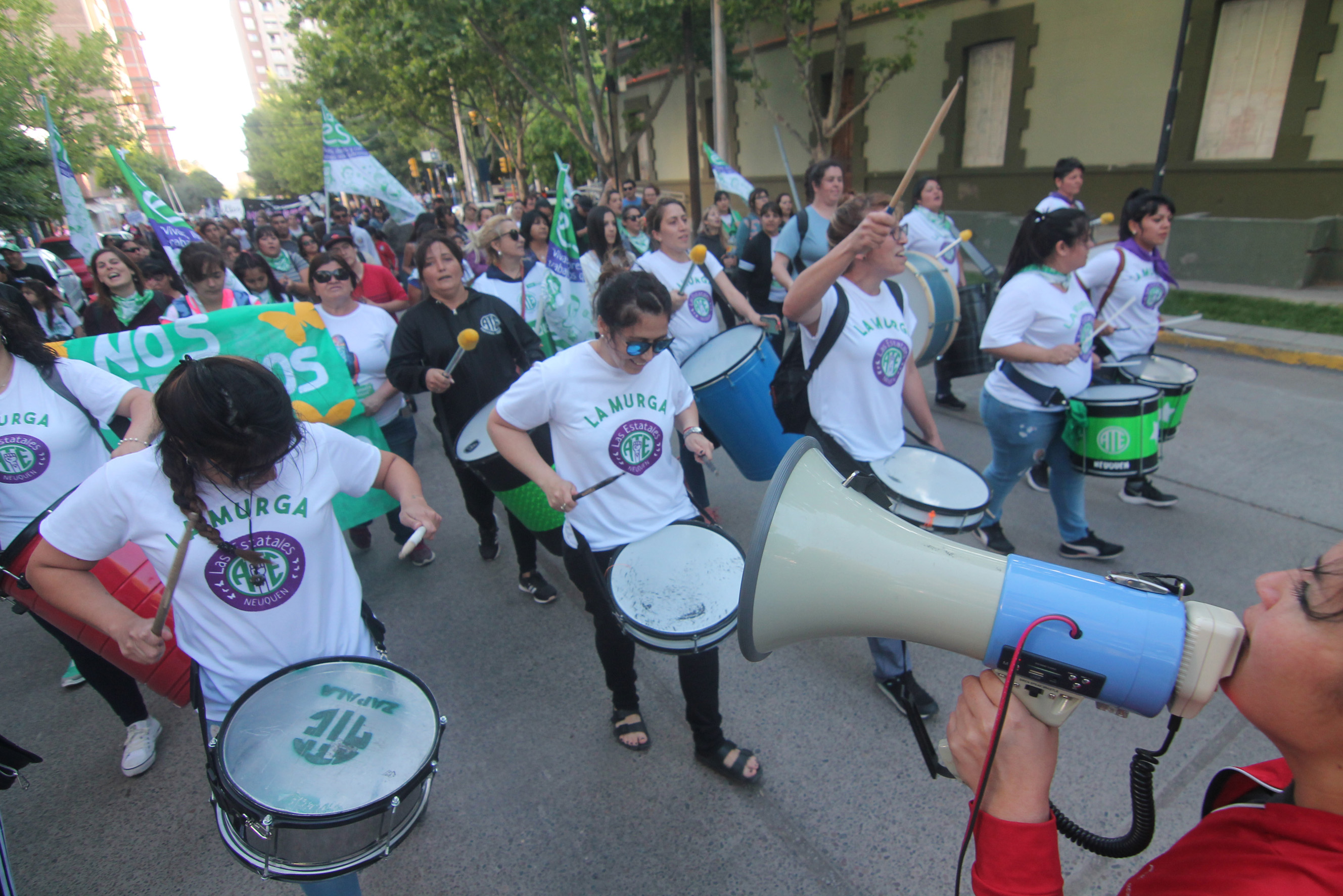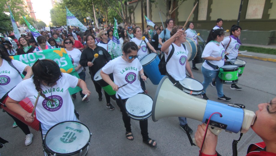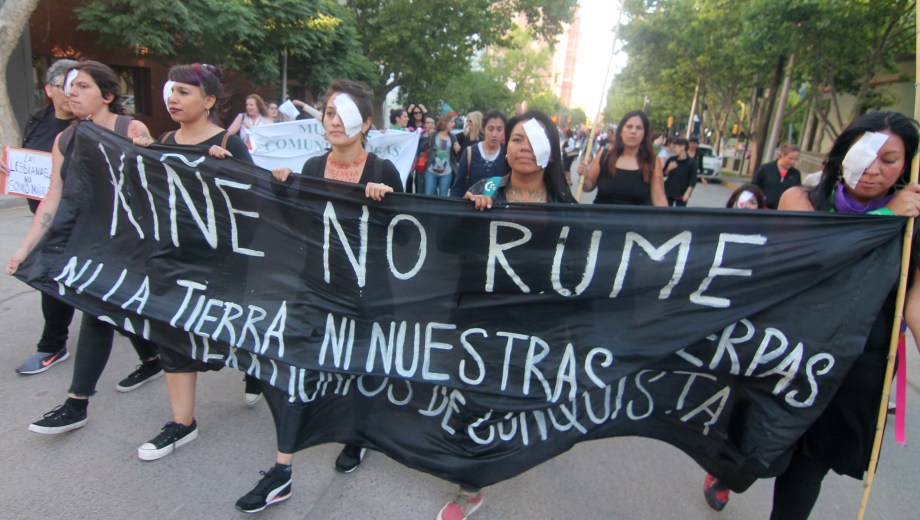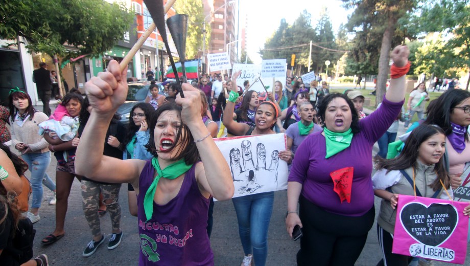Una extensa columna de manifestantes colmó el centro de la capital neuquina.  Los colores de los pueblos originarios se sumaron al verde violeta y rosado que representan: el aborto legal, la ley de emergencia y la lucha feminista.