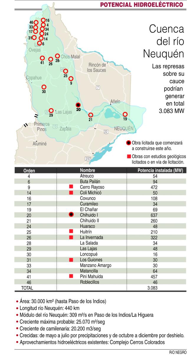 Los 20 proyectos para el río Neuquén, incluido Chihuido, podrían sumar unos 3.000 megas de potencia instalada al sistema nacional. Y lo harían con una doble ventaja. Por un lado, se trata de energía renovable, con un impacto ambiental relativamente bajo y con la posibilidad de poner bajo riego miles de hectáreas (esto último atado a otras obras que en algunos casos, como el de El Chocón, jamás se hicieron).