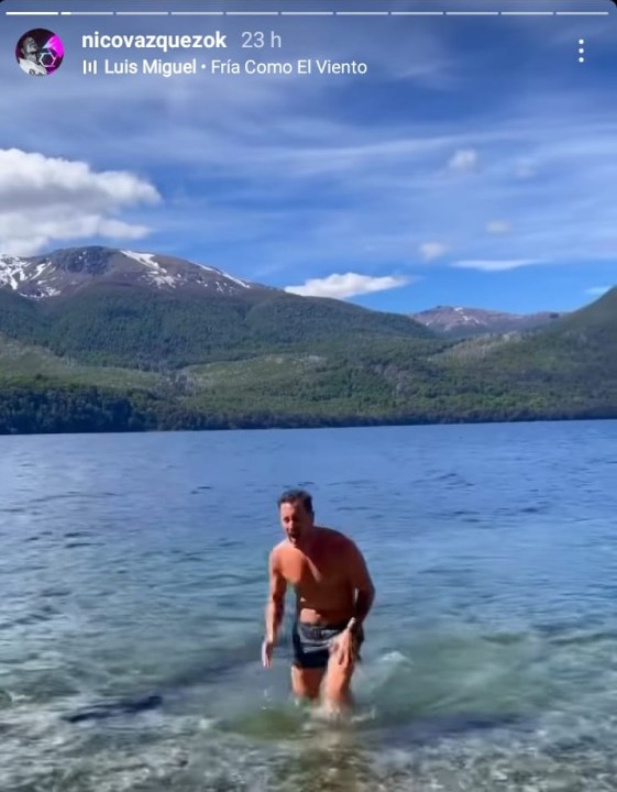 "Helada pero hermosa", dice la historia de Instagram del actor Nicolás Vázquez y de fondo suena la canción de Luis Miguel, que entona "fría como el viento, peligrosa como el mar". En el video, Nico se mete al agua del Lago Lolog en San Martín de los Anses y vive esa sensación única que dan los chapuzones en el sur. Y no es el único que se le anima, su novia Gimena Accardi, después de mostrar un paseo en lancha que hicieron, también va al agua “Estaba helada pero valió la pena”, dice la historia de la actriz.