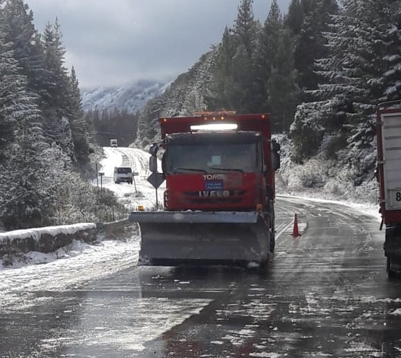 La calzada presenta baja adherencia, hay tramos con hielo y otros con nieve sobre la ruta.